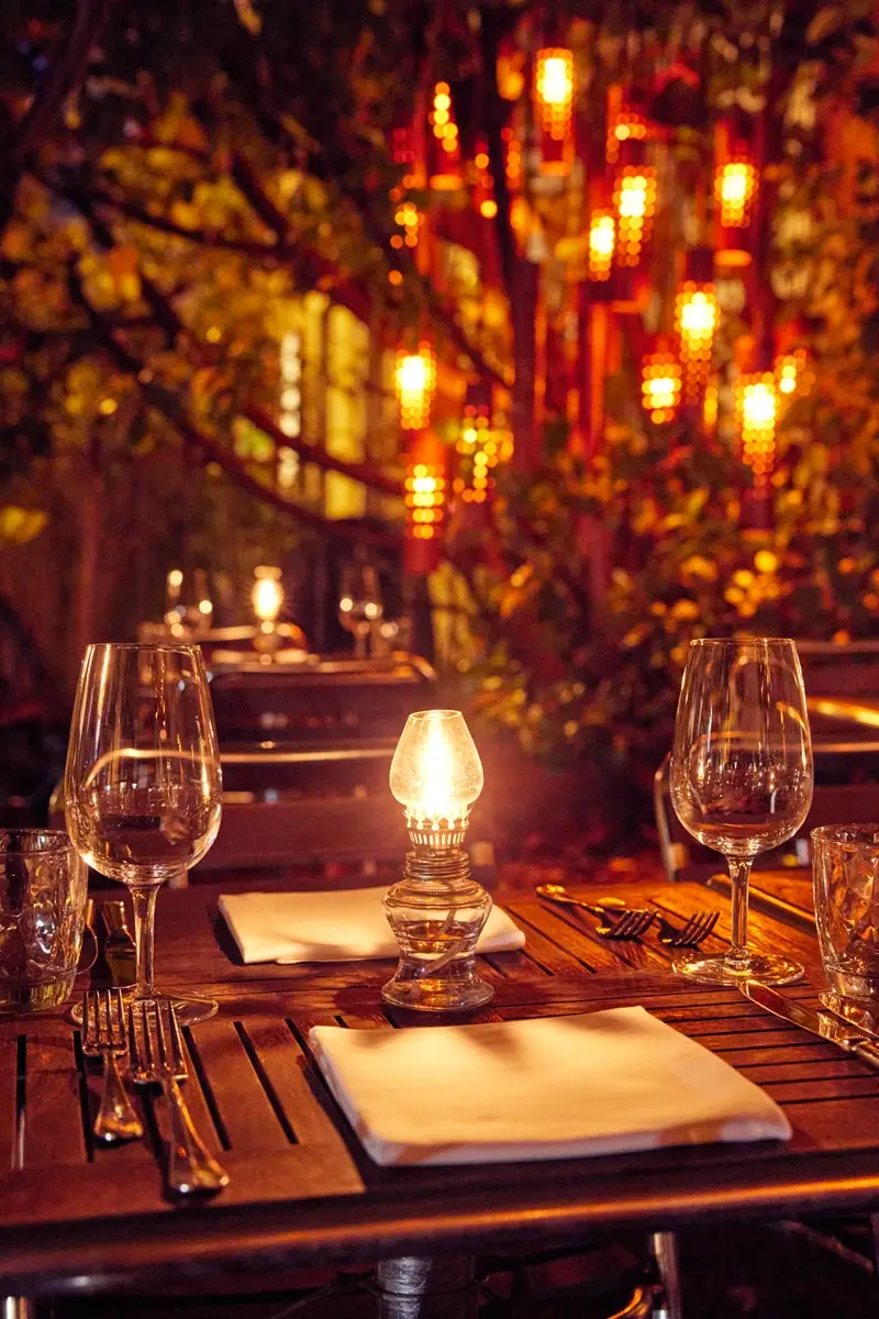 Kein Vorstadtgarten – sondern Stadt, Gespräche, gutes Essen und ein Glas auf dem Tisch.